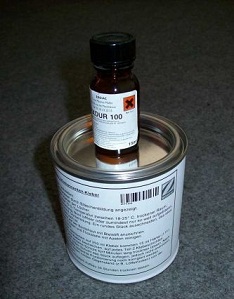 6) 2-comp. lepila dobro premešamo v razmerju: zmešajte 1 del lepila z 1 delom trdilca lepila (tj. celotni znesek trdilca s skupno razpoložljivo količino lepila).