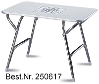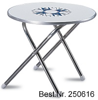 Miza za salon ali krmo vašega plovila, primerna za vsak tip čolna. Zelo stabilna, močan okvir, lep dizajn. Elegantna mizna plošča je iz visokokvalitetnega melamina-material, ki je odporen na udarce, drgnjenje, itd. Plošča je obrobljena z aluksiranim aluminijom. V sredini mize je mornarski vzorec v obliki sidra ali kompasa. Cevi so poliran vodoodporen aluminij (25mm), debelina cevi 1,5 mm. Uporabna tudi doma, za obujanje spominov na morje, kamping, prikolice, vikende itd.
