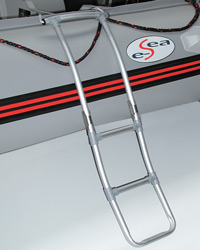 Montaža: lestev se pritrdi s pomočjo karabinarja na zadnjo desko pri motorju, nato se preko tube spusti v vodo ali pri večjih gumenjakih, karabinar gre na notranjo stran tube, kjer si naredite pomožno uho ali objemko. Enostavno, ne moti med vožnjo, ker je preklopna in jo potegnete v čoln. Ko so vsi potniki že v čolnu, brez problema potisnite čoln v globoko vodo, nato stopite na lestev, se potegnete v čoln in ni bojazni pred poškodbami čolna. Zelo koristno na otokih in plitvinah, tam kjer so ježki in ostre skale.