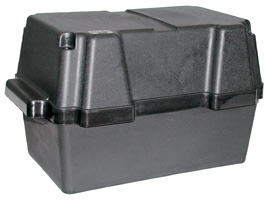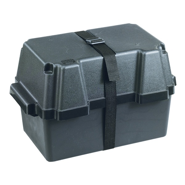 Zelo kompaktna škatla za vse vrste kislinskih, gel in AGM akumulatorjev moči 80 Ah in 100Ah. Box je kislinsko zaščiten, na pokrovu ima prostor za priključna kabla, dodatno je priložen pas s avtomatsko sponko za varno zapiranje škatle.
